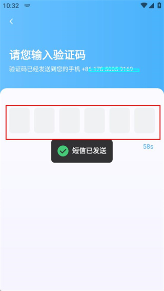 4、将收到的验证码依次填入对应的输入框中,完成验证步骤,推进登录注册流程。