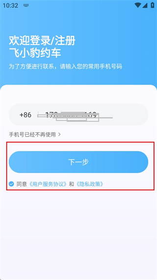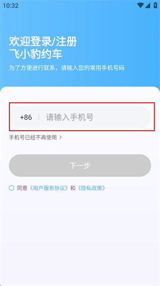 1、打开飞小豹约车,进入登录注册页面,找到手机号输入框,准备填写常用手机号码。