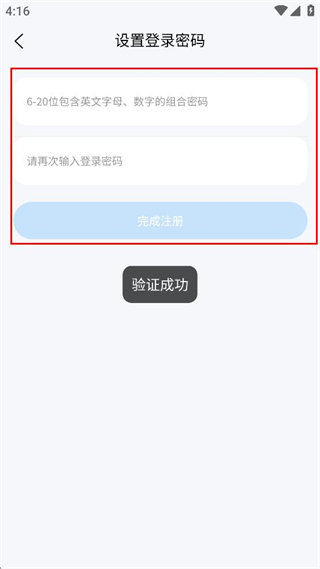 4、进入设置登录密码页面,按要求设置并确认密码,准备完成注册。