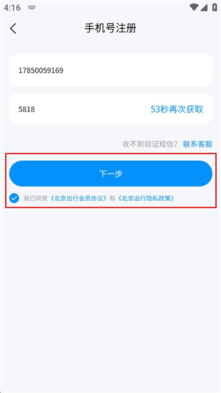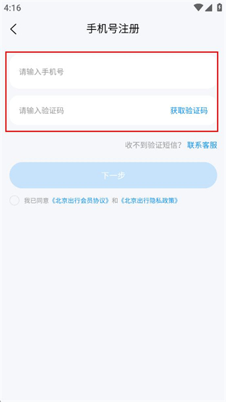1、进入北京出行登录页面,点击注册选项,进入手机号注册界面。