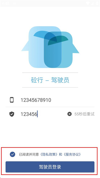 3、填写收到的验证码,勾选同意相关协议后点击驾驶员登录按钮完成操作。