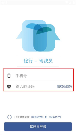 1、打开砼行驾驶员应用,在服务协议窗口中点击同意按钮,进入登录页面。