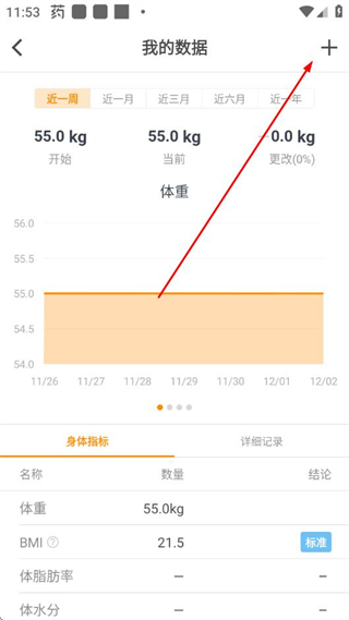 3、在我的数据页面点击右上角+,打开添加体重的弹窗。