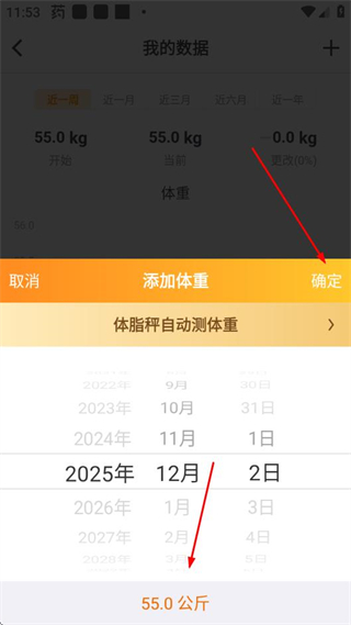 4、在弹窗中选择日期、输入体重数值,点击确定,完成体重记录。
