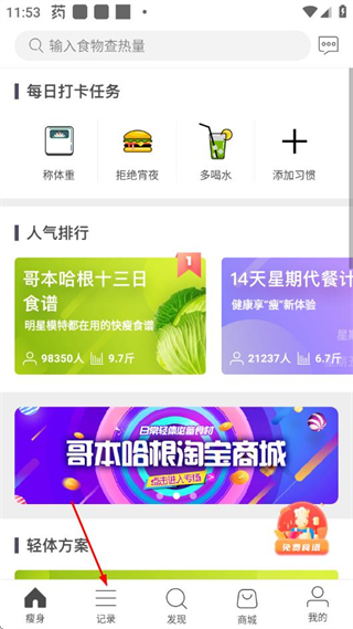 1、打开哥本哈根减肥APP首页,点击底部记录,进入记录与数据页面。