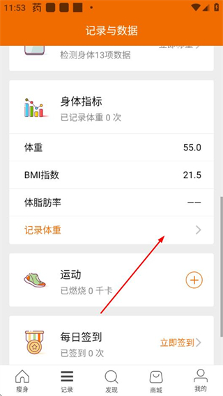 2、在记录与数据页面,点击记录体重,进入我的数据页面。