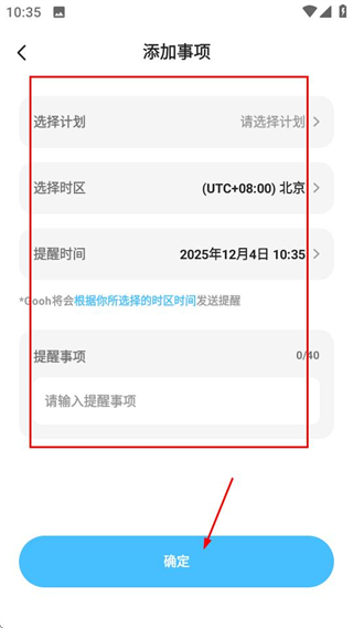 4、在添加页面,填写提醒信息后点击确定,完成行程提醒的添加。
