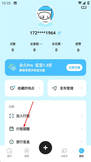 2、在个人中心页面,点击行程提醒选项,进入提醒事项页面。