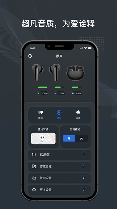 原声app专为蓝牙耳机用户设计的手机APP,旨在帮助用户更好地使用耳机,提供全方位的音质优化和个性化定制功能。无论是电量显示、降噪通透、EQ调节、按键设置还是远程空中升级(OTA)。
