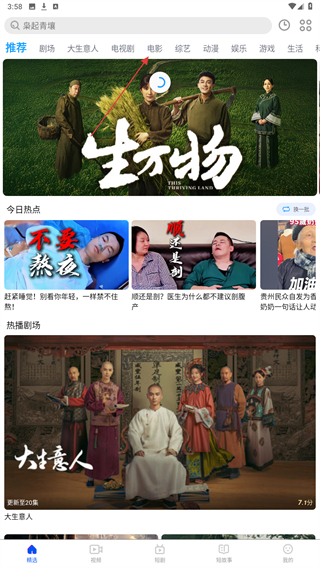 1、启动APP进入首页,在首页顶部导航栏找到并点击剧场标签,进入剧场专属页面,可看到热门短剧、精选短剧等分类内容。