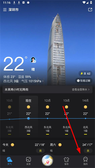 1、进入天气展示界面后,点击底部导航栏最右侧的我的选项,进入个人功能页面。