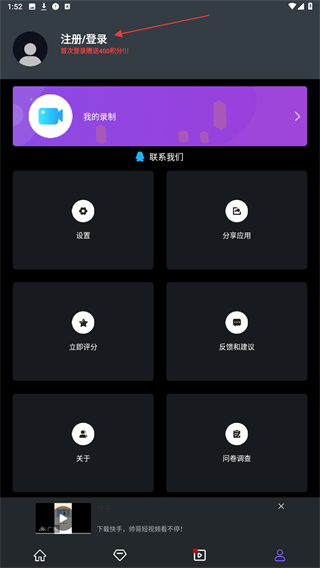 2、进入我的页面内,点击上方注册/登录的按钮。