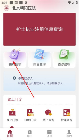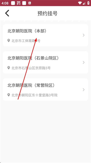 1、在朝阳健康云的首页,点击预约挂号选项,进入院区选择页面。