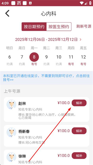 5、在心内科页面选择就诊日期,点击目标医生对应的候补。