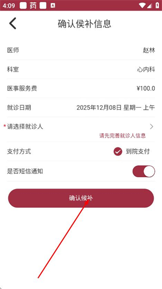 6、完善就诊人信息后,点击确认候补按钮,完成挂号流程。