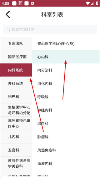 4、在科室列表页面选择目标科室分类,再点击对应科室。
