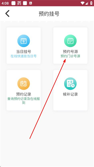 3、在挂号方式选择页面点击预约号源选项,进入科室列表页面。