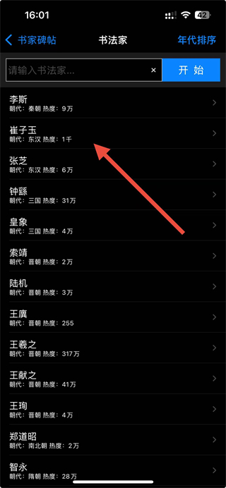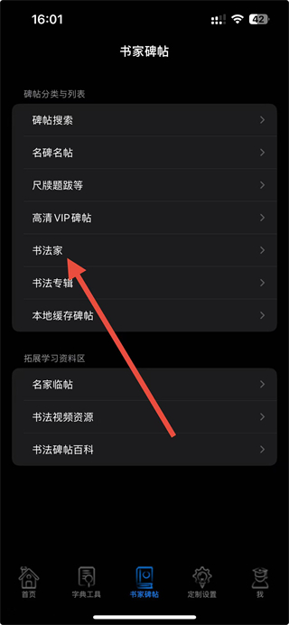 2、在书家碑帖页面中,找到书法家选项,点击该选项进入书法家列表界面。