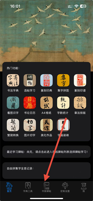 1、这里是平台的主页之中,一进入这里就可以看到各种不同内容的书法功能,满足你关于一切书法上的需求,字典、学习、识字等书写方面的帮助;