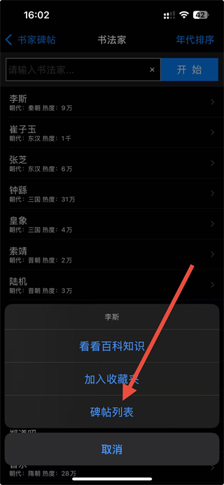 4、在弹出的操作菜单中,点击碑帖列表选项,即可查看该书法家对应的碑帖内容。