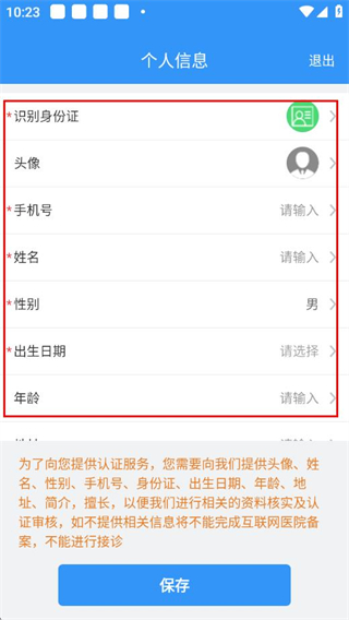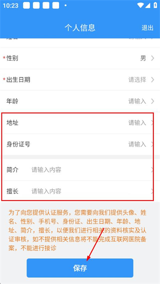 3、补充地址、身份证号、简介、擅长等信息后,点击保存,完成账号注册流程。