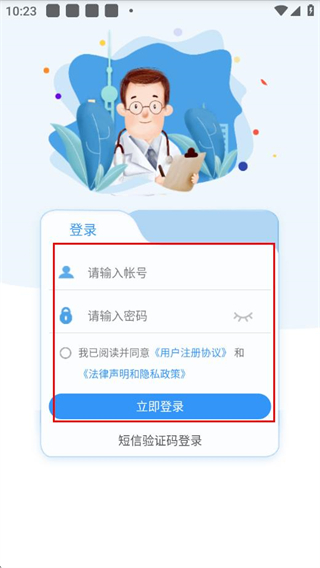 1、在医见通医生端app的登录页面,输入账号和密码,勾选协议后完成登录。