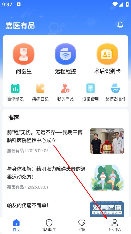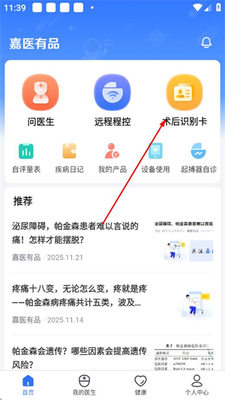 1、在嘉医有品app的首页,点击术后识别卡选项,进入术后识别卡页面。