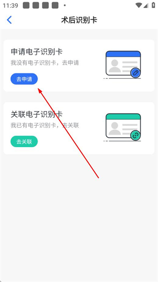2、在术后识别卡页面点击申请电子识别卡下方的去申请,进入申请术后识别卡页面。