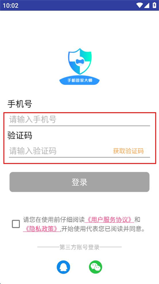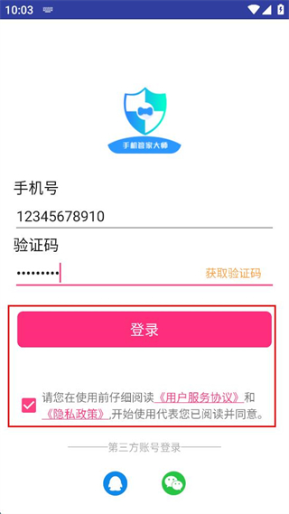 4、勾选用户服务协议和隐私政策的复选框,点击登录按钮完成账号登录。