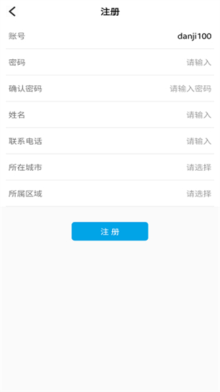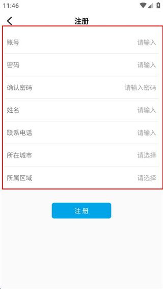 2、在注册界面依次填写账号密码姓名等信息,选择所在城市和所属区域后点击注册。