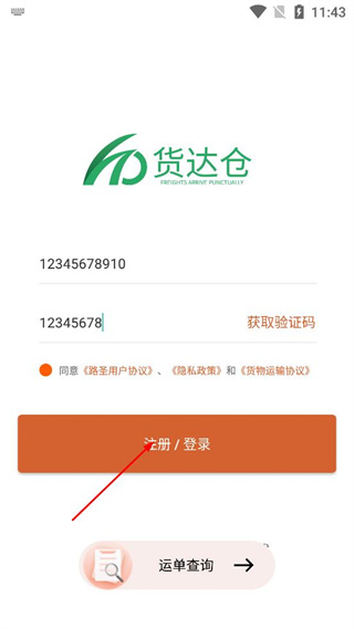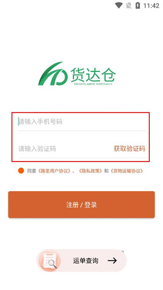 1、进入货达仓登录界面,在对应输入框中填写手机号码,再点击获取验证码。