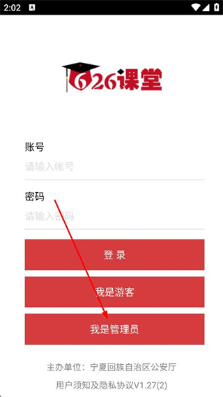 1、打开626课堂,在登录页面,选择并点击我是管理员选项。