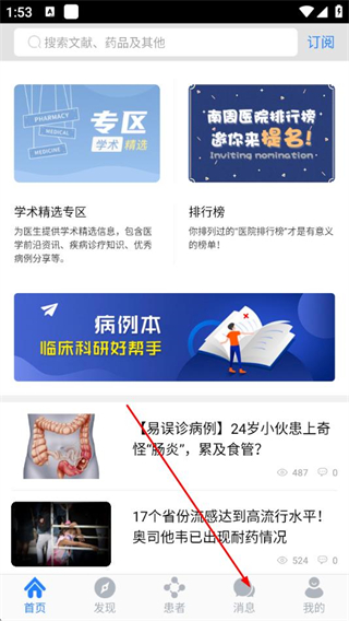 1、打开医库app的首页,点击底部导航栏的消息选项,进入消息界面。
