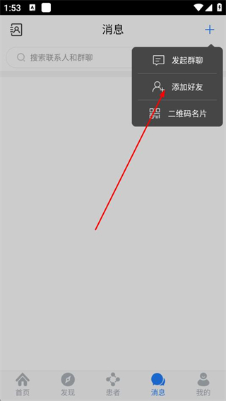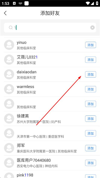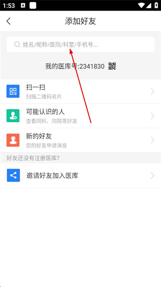4、在添加好友页面的搜索框中,输入对方的姓名、昵称、医库号等信息进行搜索。