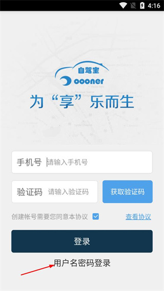 1、打开自驾宝软件,在初始登录页面点击下方的用户名密码登录选项,切换登录界面。