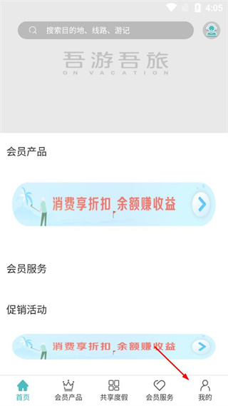 1、打开吾游吾旅软件,点击首页底部导航栏最右侧的我的选项,进入我的页面。