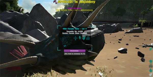 需要注意的是我们要保证一直有食物投放给恐龙,驯服槽才能一直增加,而昏迷槽则要我们不断的投放黑色的果子来增加昏迷时间,如果昏迷槽清空之后我们仍然没有驯服恐龙的话,就代表着驯服失败,注意黑色的果子恐龙是不会自己吃的需要我们强行让它吃下去;