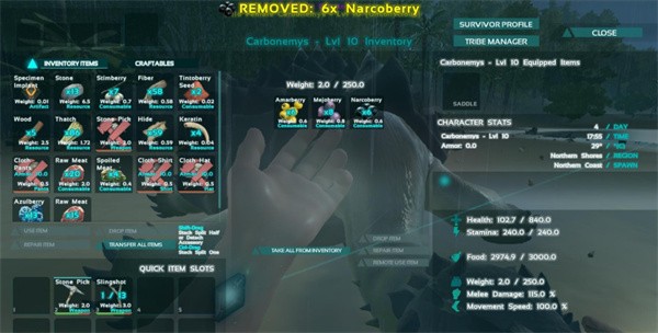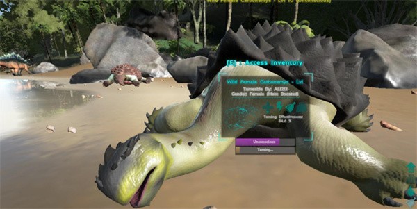 当我们将恐龙打晕之后,恐龙头上会出现一个带有紫色条的对话框,然后按e打开我们的背包,然后将食物投放到中间恐龙的背包当中,恐龙会吃掉这些食物,但是恐龙的负重是有上限的;