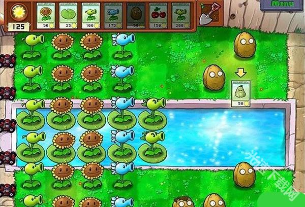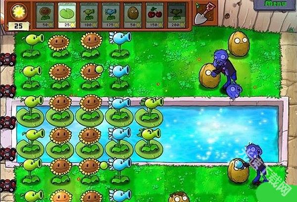 1、进入白天带游泳池的地图。老样子,先5向日葵。甭管他僵尸走多近,绝对来得及。然后看哪路有僵尸,就放一棵豌豆射手。