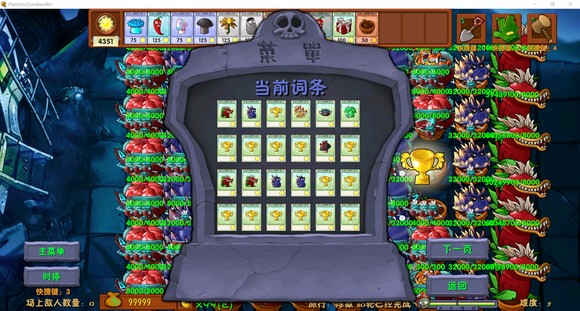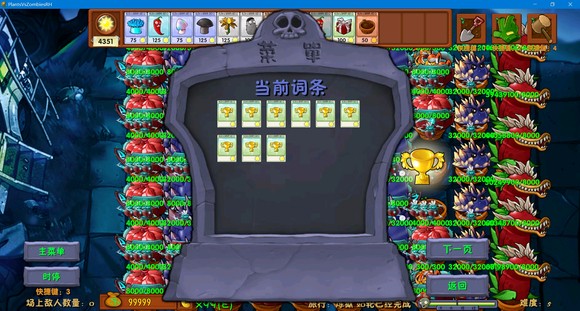 僵尸词条:读报免控,机鱼双词条,丑跳必爆,三叉戟双词条,白舞王双词条,尸王双词条,三叉戟冲车免控,阳光/10,僵尸最大值100,每关必出舞王冰车