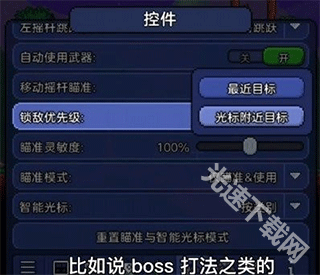3、按键吧移动与瞄准按钮扩大,能够够方便玩家进行操作,留下了放大/缩小视距方便玩家查探,还有快速喝药的按钮,最后在放置智能光标按钮以及锁定按钮,能够帮助你快速的上手击打boss。