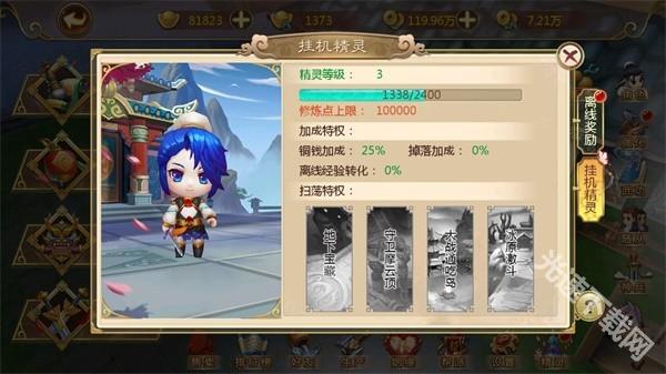 除了角色可以获取经验之外,挂机精灵的经验也会增长。当挂机精灵升级时,玩家可以获取更多“扫荡特权”,可以使用扫荡券扫荡之前无法扫荡的试炼副本。也会在之后的离线挂机中获得更高的铜钱、掉落和经验加成!