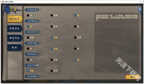 7、选择其中一种你想要扮演的势力后,设置好自己的游戏设定,比如发展速度、受伤概率、武将成长、武将功绩、武将成长等参数即可开始游戏。