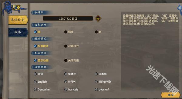 4、点击设置,玩家可以自定义修改游戏的分辨率、语言、显示动画、游戏模式等参数