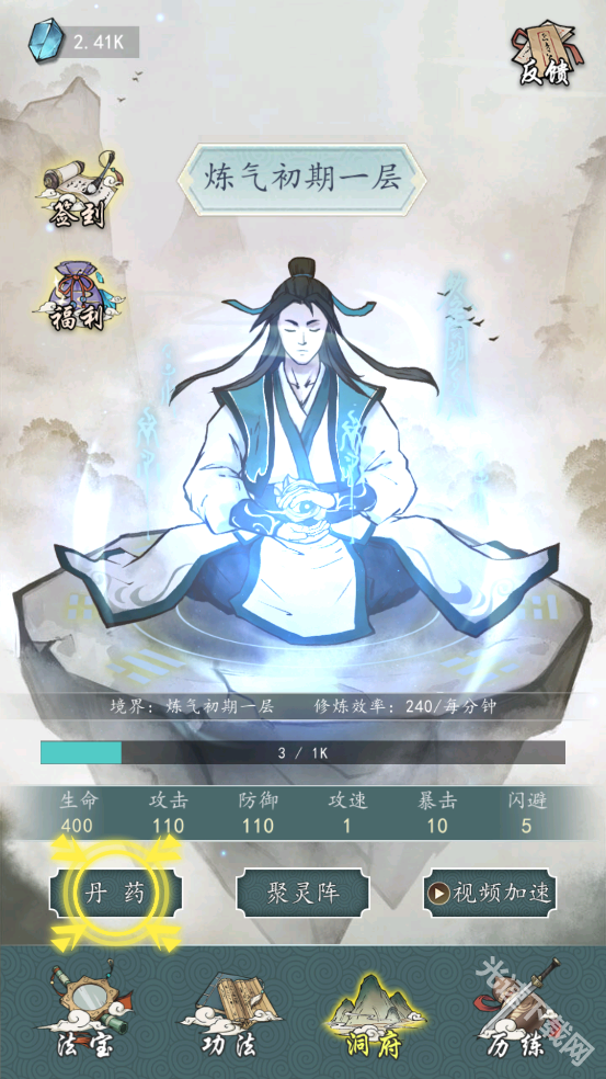4、之后通关后,点击“确定”即可领取奖励!然后点击“洞府”,进入境界页面。在这里你可以通过丹药的使用来提升角色修仙的经验值,之后完成突破即可提升战力,另外聚灵阵、法宝、功法等玩法也是辅助玩家战力提升的关键,别忘了及时的查看并装备!