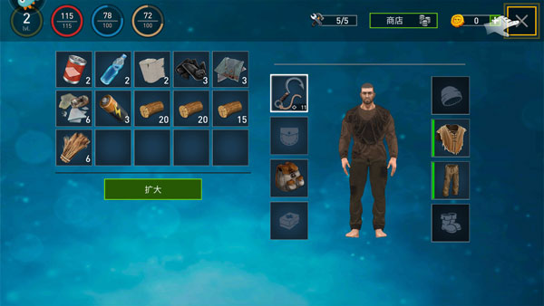 1、开局时用钩子收集资源,注意不要漏木桶,勾不到就下水捞,先造杯子和煮水器,然后造炉子和鱼竿;