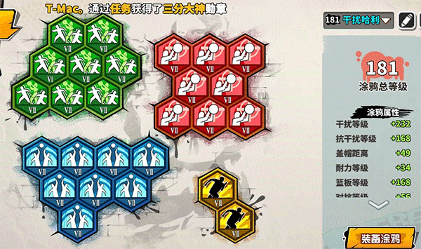 说明:如果觉得帽后仰等投篮比较困难的话可以选择三帽距和五干扰涂鸦;如果走位好的话,可以选择满干扰(七级干扰涂鸦加帽距)。另外,现在这个版本不推荐哈莉带抗盖帽涂鸦,主要是因为哈莉的抗盖帽基础属性只有235,而现在主流的PG训练营都选择的盖帽值,所以哈莉推抗盖帽意义不大。