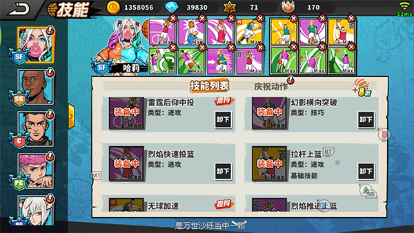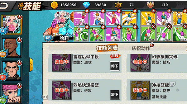 说明:一般是三号位哈莉主攻,所以佩戴了拉杆上篮、雷霆后仰中投、烈焰推进上篮、烈焰快速投篮等多个进攻技能,打法多变,对方防守时很难把握。