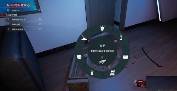 2、上方的是必须完成的任务“处理尸体”,下方按区域划分的任务“处理血迹”等是衡量任务完成的标准。