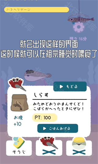 1、点击下方的螃蟹图标,消耗bp值可以购买食物,将食物投放进水池即可